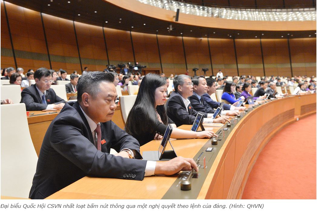 Đại biểu Quốc Hội CSVN nhất loạt bấm nút thông qua một nghị quyết theo lệnh của đảng. (Hình: QHVN)