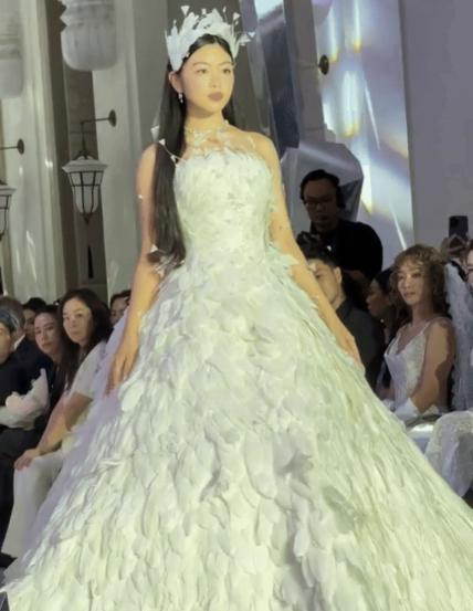 Đáng chú ý, buổi diễn bất ngờ có sự tham gia của Lọ Lem trong vai trò người mẫu. Khoác lên mình một thiết kế cầu kỳ, chiếc váy cúp ngực trắng muốt của Lọ Lem được phủ đầy lông ngỗng, cùng với những bước đi khoan thai, từ tốn.