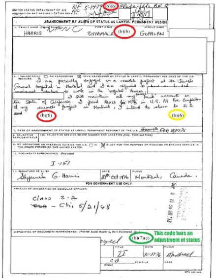Bây giờ, điều tiếp theo này không ảnh hưởng gì cả, tôi nghĩ vậy. Nhưng mẹ của Kamala đã có lệnh trục xuất hết hạn 5 ngày trước khi Kamala chào đời! Ngoài ra, khi mẹ của Kamala Harris khai rằng mình là người da trắng trên giấy khai sinh của cô con gái người Ấn Độ, Trên giấy khai trục xuất người nước ngoài của INS, bà đã che giấu quốc tịch của bà là công dân Ấn Độ, vi phạm Đạo luật Walter-McCarran năm 1952 kiểm soát việc nhập cư của người nước ngoài khi bà đến vào năm 1958.