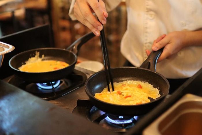 Trong khi đó, 12 món Việt ăn sáng do ông Thắng đứng bếp bao gồm salad, bánh mì bơ, mứt, trứng ốp la, mì xào, cháo hoa, bún ngan măng, rau xào, cari gà khoai tây, cơm trắng, cơm rang, trái cây, bánh ngọt, cà phê...
