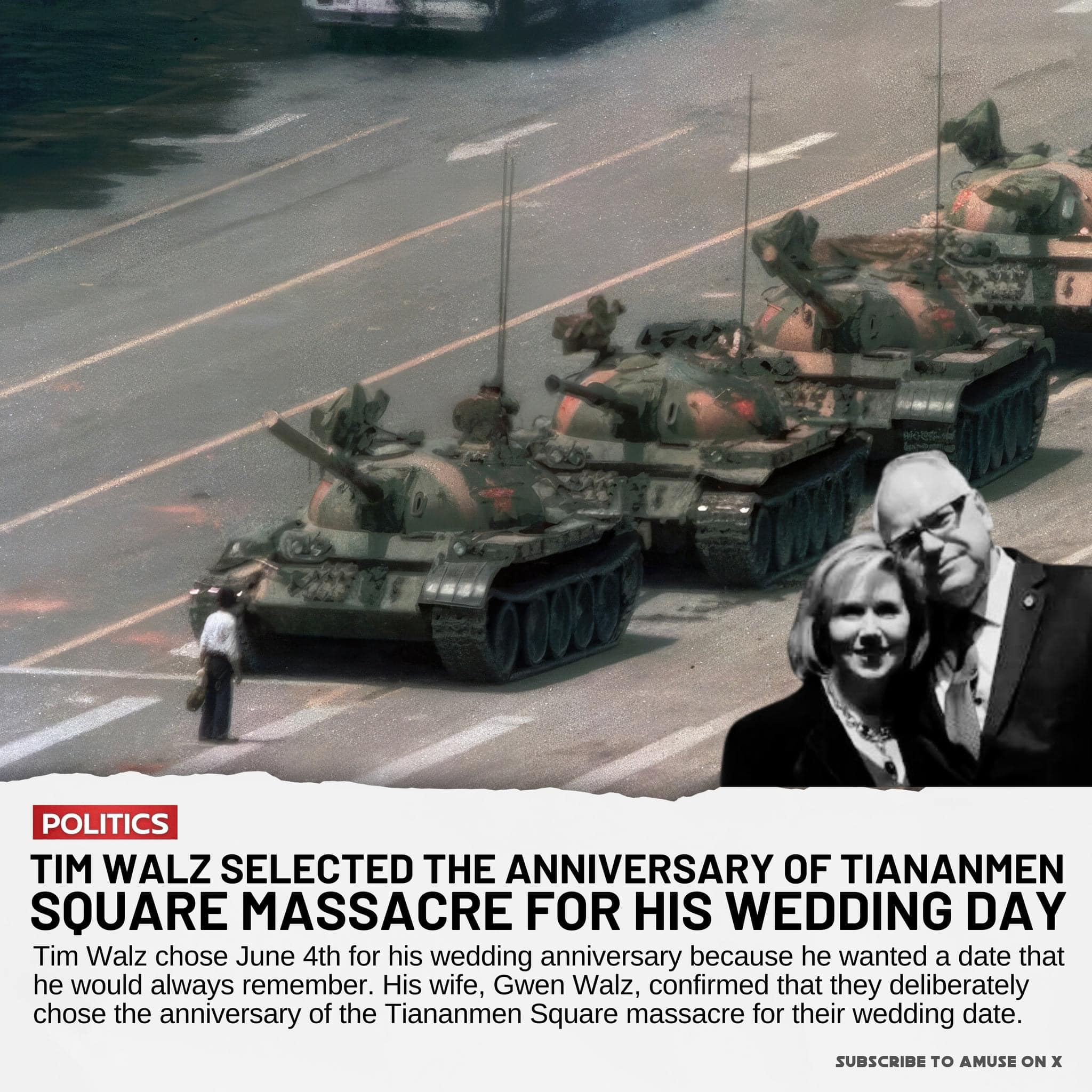 Walz từng dạy học ở Trung cộng và qua lại nước cộng sản này hơn 30 lần. Và khi những người yêu tự do tưởng niệm vụ thảm sát Lục Tứ thì vợ chồng Tim Walz - Gwen Walz cắt bánh, mở champagne mừng ngày cưới.