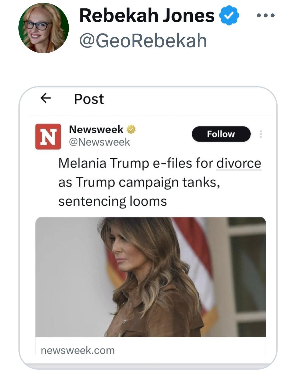Tin từ nhà báo Andy Ngo, Rebekah Jones là một tài tử sáng chói của đảng dân chủ. Cô kiếm bộn tiền bằng cách loan những tin xạo, láo. Tin bà Melania ly dị kèm với một tin của báo Newsweek đã được chỉnh sửa, giúp cô kiếm bộn bạc từ những người dân chủ.
