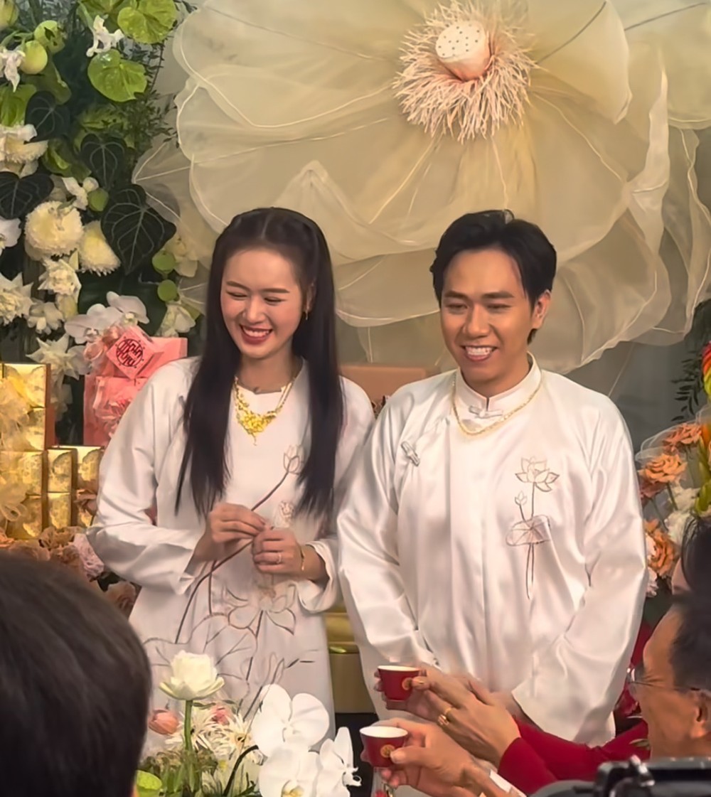 Cô dâu Anh Phạm (tên thật là Quỳnh Anh) khoe nhan sắc ngọt ngào khi diện áo dài trắng tinh khôi, thêu hoa sen. Trong khi chú rể Anh Đức cũng mặc áo dài truyền thống cùng tông màu trắng.
