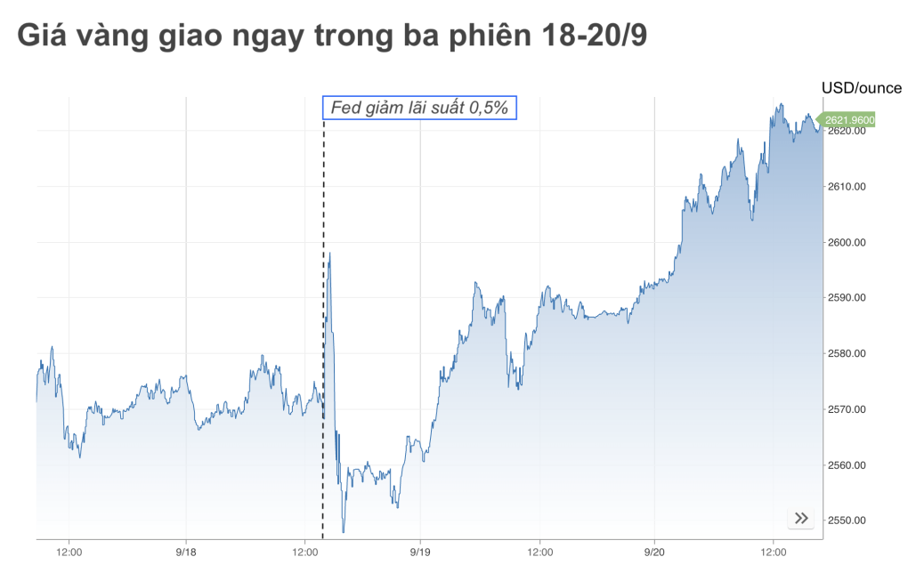 Ngay lập tức, giá vàng thế giới tăng liên tiếp hai ngày cuối tuần. Chốt phiên giao dịch 20/9, mỗi ounce giao ngay tăng 36 USD lên 2.621 USD, mức cao nhất lịch sử. Kéo theo đó, giá vàng nhẫn trơn trong nước cũng tiến lên mức kỷ lục 80,5 triệu đồng một lượng.