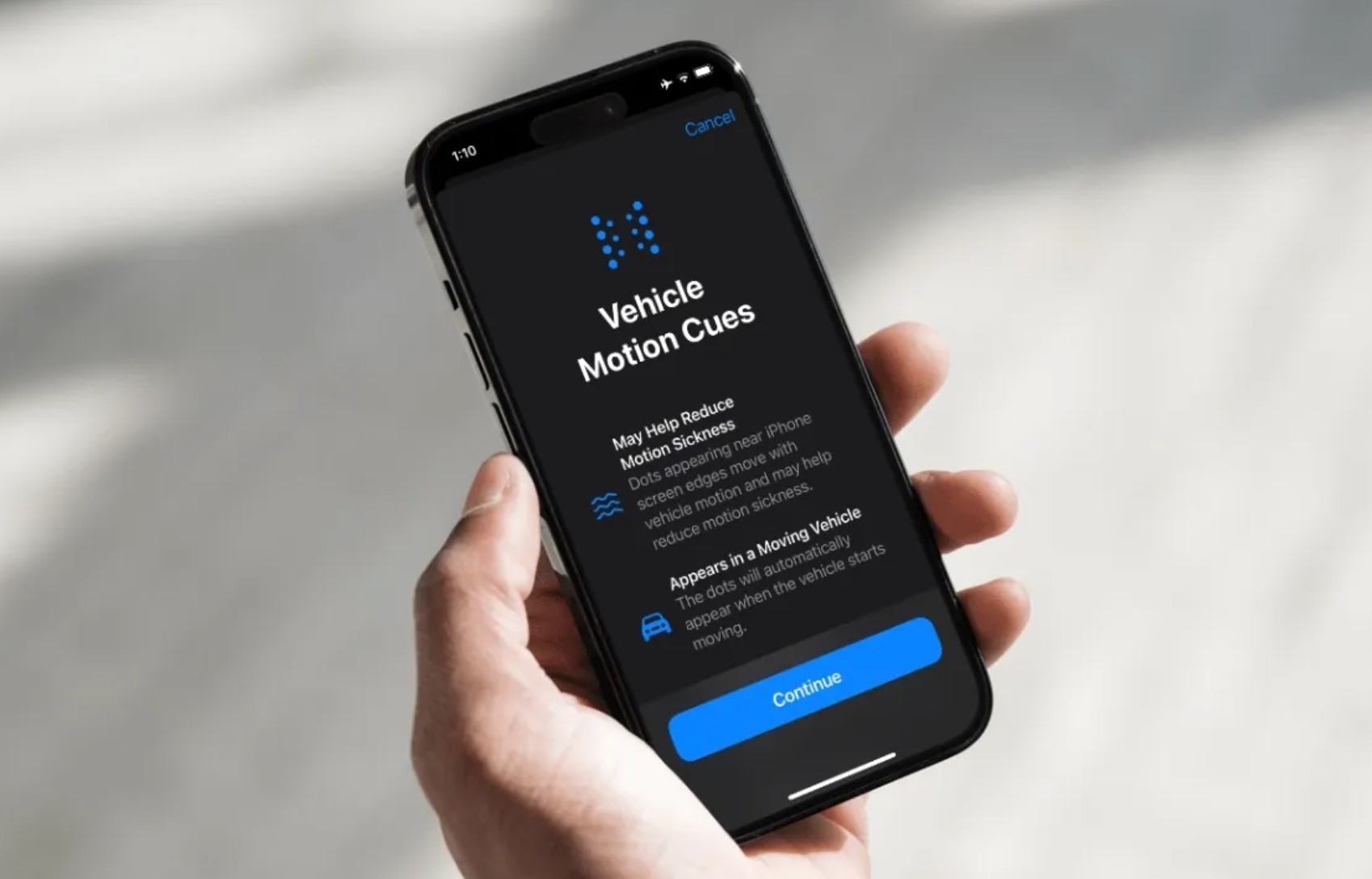 "Với Vehicle Motion Cues, các chấm trên cạnh của màn hình di chuyển theo những thay đổi trong chuyển động của xe để giúp giảm xung đột cảm giác mà không làm ảnh hưởng đến nội dung. Sử dụng các cảm biến được tích hợp trong iPhone và iPad, Vehicle Motion Cues nhận ra khi người dùng ở trong xe đang di chuyển và phản hồi phù hợp. Tính năng này có thể được thiết lập để tự động hiển thị trên iPhone hoặc có thể bật và tắt trong Control Central."