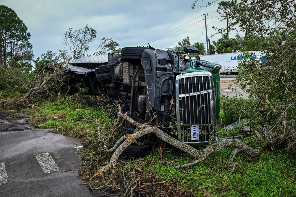 Xe tải bị lật ở Lakewood Park, bang Florida sau lốc xoáy do bão Milton ngày 10/10. Ảnh: AFP