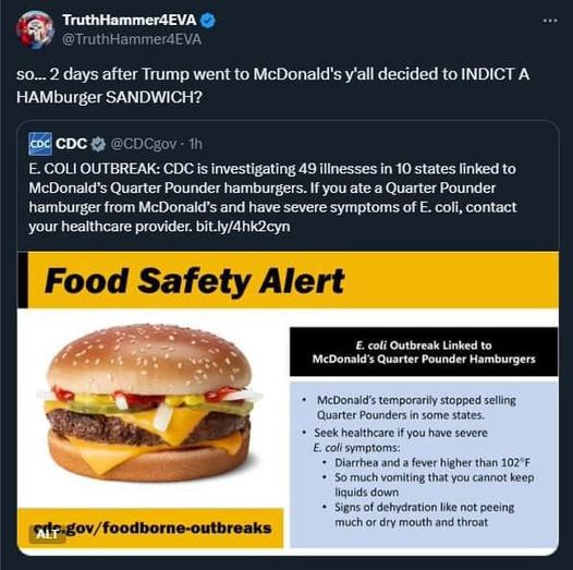Sau 2 ngày ông Trump đến làm thử việc ở McDonalds thì CDC của ông Biden truy tố bánh Hamburger của McDonalds về an toàn vệ sinh thực phẩm.