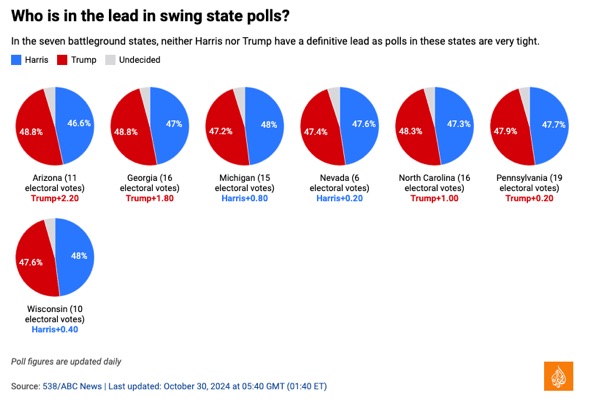 Biên độ của cả hai ứng cử viên đều nằm trong biên độ sai số trung b́nh của các cuộc thăm ḍ, nghĩa là một trong hai ứng cử viên có khả năng dẫn đầu. Trong khi hầu hết các cuộc thăm ḍ cho thấy Harris đang dẫn trước trong cuộc bỏ phiếu toàn quốc, th́ hai ứng cử viên này lại rất cân sức ở các tiểu bang dao động.