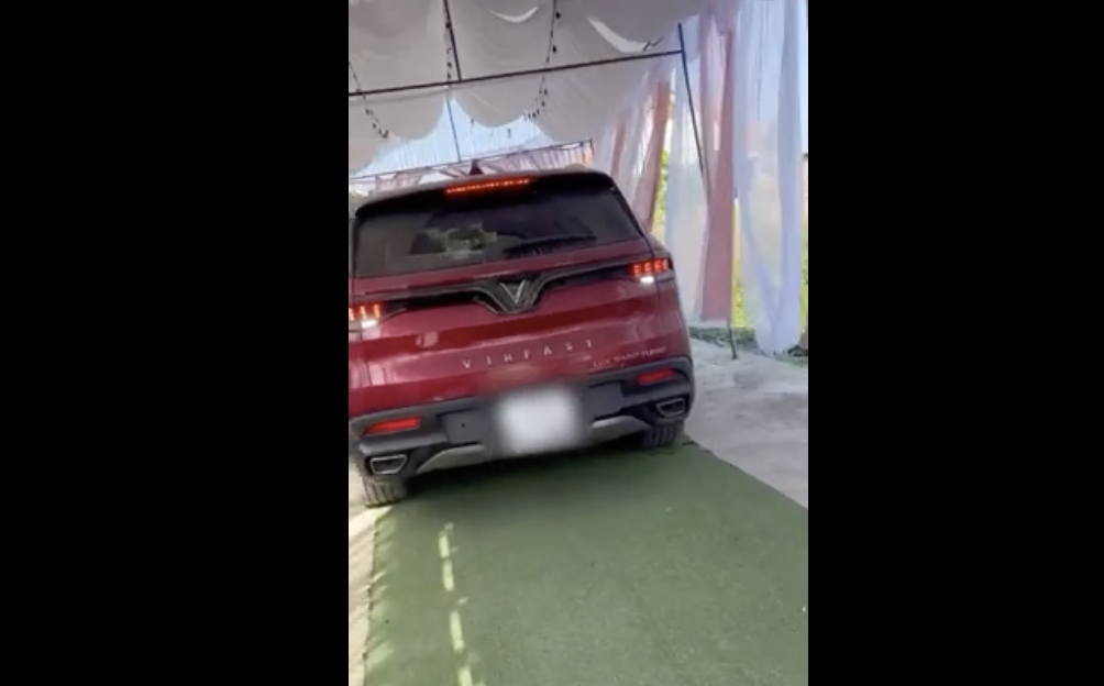 Clip ghi lại cảnh ông M. lái xe lùi gãy cổng rạp cưới nhà hàng xóm.