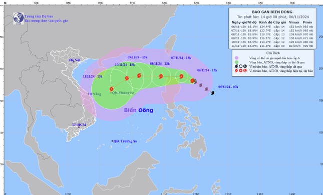 Cập nhật mới nhất từ Trung tâm Dự báo Khí tượng Thủy văn Quốc gia, hồi 13h ngày 6/11, vị trí tâm bão ở vào khoảng 18,1 độ Vĩ Bắc; 124,4 độ Kinh Đông, trên vùng biển phía Đông Bắc đảo Luzon (Philippines).