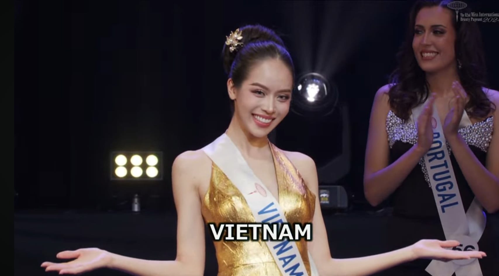 Hình ảnh Thanh Thủy - đại diện Việt Nam khi được xướng tên vào Top 20 Miss International 2024. (Ảnh: Chụp màn hình)