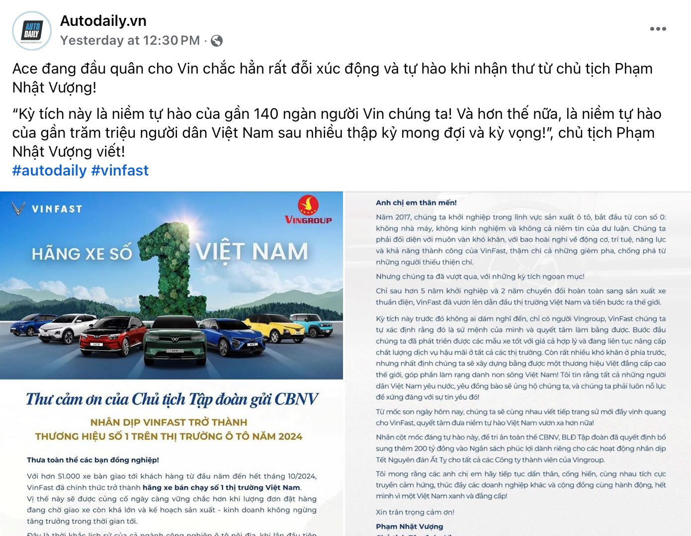 "Đây là thời khắc lịch sử của cả ngành công nghiệp ô tô nội địa, khi lần đầu tiên thương hiệu ô tô Việt vượt qua tất cả các hãng xe nước ngoài để chiếm thị phần số 1 Việt Nam", ông Phạm Nhật Vượng viết trong phần mở đầu bức tâm thư nội bộ gửi tới 140.000 cán bộ nhân viên Vingoup.