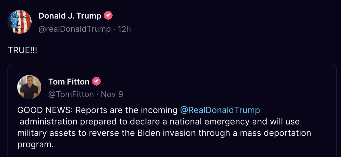 Tổng thống đắc cử Mỹ Donald Trump xác nhận trên nền tảng mạng xã hội Truth Social của mình về việc sẵn sàng ban bố tình trạng khẩn cấp quốc gia và sẽ sử dụng lực lượng quân sự để đảo ngược cuộc ‘xâm nhập’ (của người di cư) dưới thời Biden thông qua chương trình trục xuất hàng loạt. Ảnh chụp màn hình: Donald Trump/Truth Social