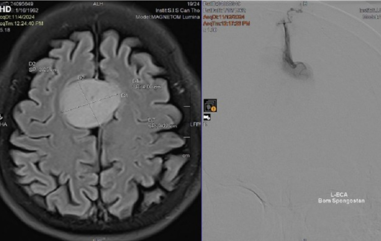 Tuy nhiên, trên hình ảnh kiểm tra ghi nhận, bệnh nhân có khối u não kích thước lớn (35 x 40mm) nằm giữa đỉnh đầu, chấn thương do tai nạn không liên quan đến khối u này. Tai nạn giao thông trở thành tình huống may mắn giúp bệnh nhân được chẩn đoán, điều trị khối u não. Để tránh biến chứng nguy hiểm đến tính mạng của người bệnh, các bác sĩ đã thực hiện tắc mạch, phẫu thuật loại bỏ khối u.