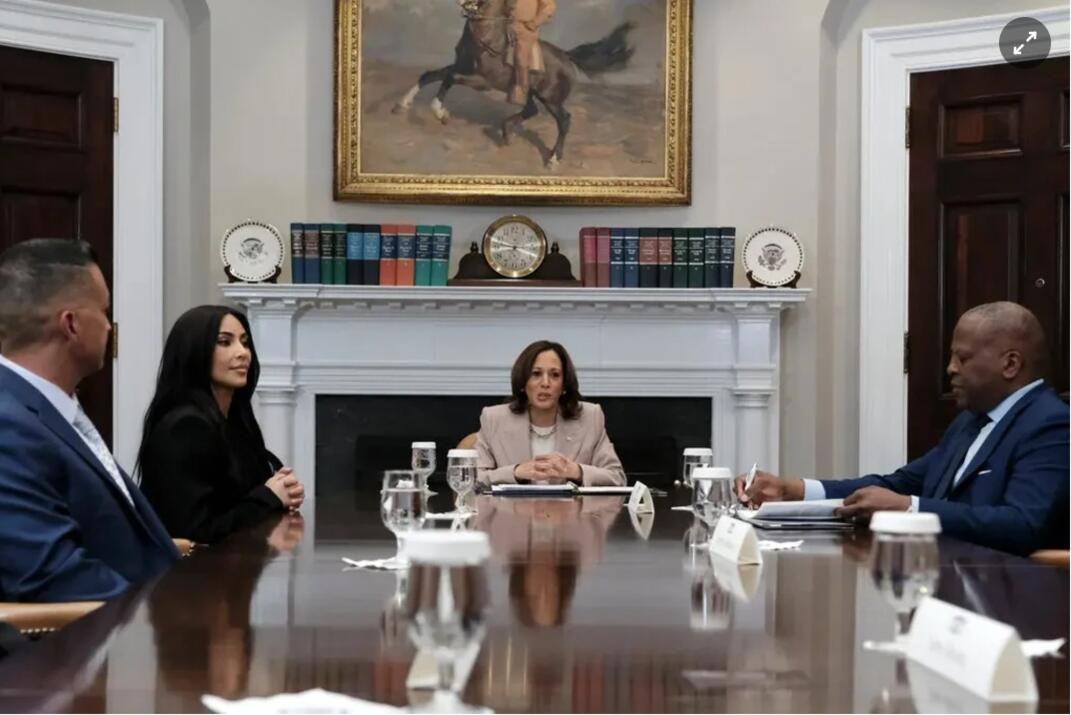 Kardashian trong cuộc gặp với Phó Tổng thống Kamala Harris hồi tháng 4. Ảnh: New York Times.
