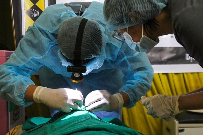 Cán bộ Ngân hàng mô Bệnh viện Mắt Hà Nội 2 thực hiện lấy giác mạc của cụ ông hiến tặng - Ảnh: T.M