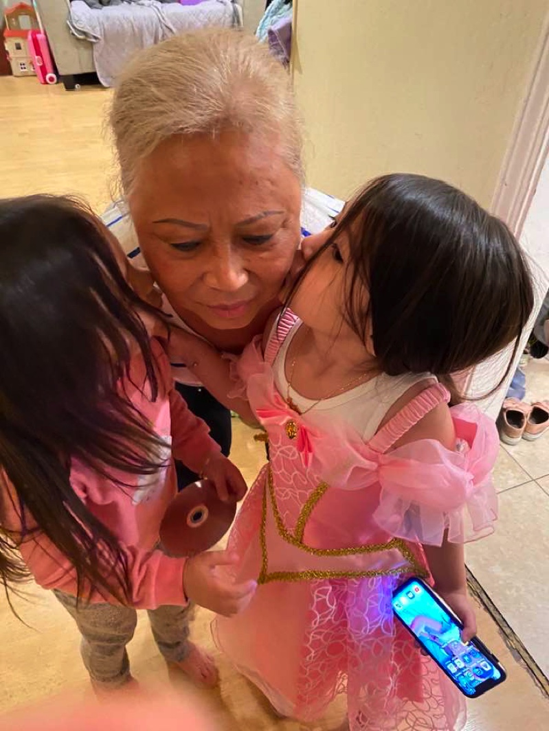 Ảnh mẹ nữ ca sĩ và bố của nữ ca sĩ Bích Tuyền lúc c̣n sống được các cháu, Sophia (con chung của nữ ca sĩ và ông Gerard hôn má)