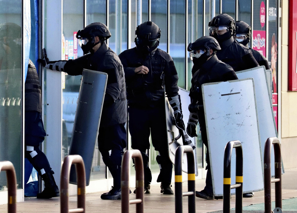 Cảnh sát mặc đồ bảo hộ chờ vây bắt gấu bên ngoài siêu thị thành phố Akita, Nhật Bản, ngày 2/12. Ảnh: AFP