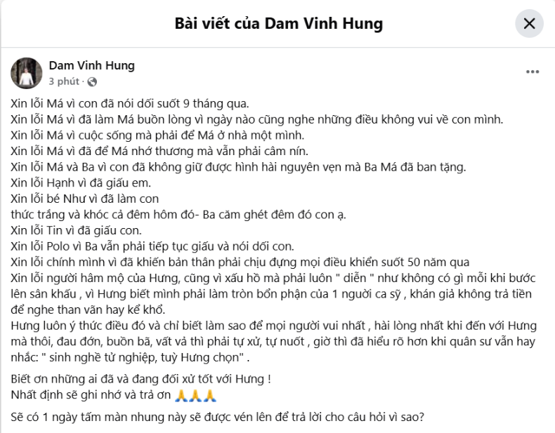 Theo đó, nam ca sĩ gửi lời xin lỗi tới cha mẹ, các con và chính bản thân mình. Cụ thể, Đàm Vĩnh Hưng viết trên trang cá nhân: “Xin lỗi má vì con đã nói dối suốt 9 tháng qua. Xin lỗi má vì đã làm má buồn lòng vì ngày nào cũng nghe những điều không vui về con mình.
