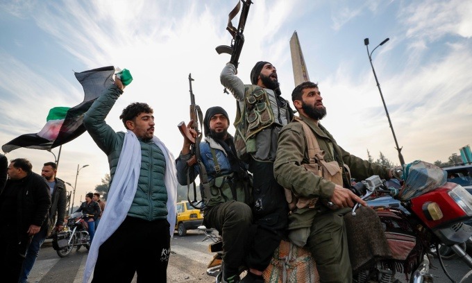 Phiến quân ăn mừng tại thủ đô Damascus, Syria, sau khi kiểm soát thành phố ngày 8/12. Ảnh: AP