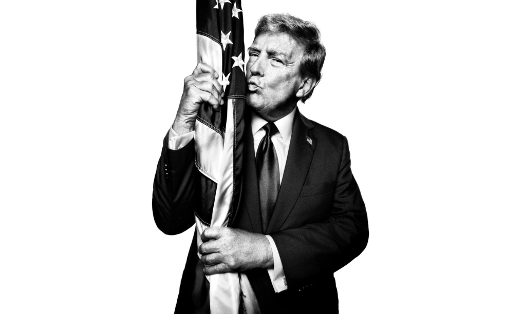 Ông Trump tạo dáng ôm hôn quốc kỳ Mỹ trong buổi chụp hình ở Mar-a-Lago hồi tháng 11. Ảnh: Time