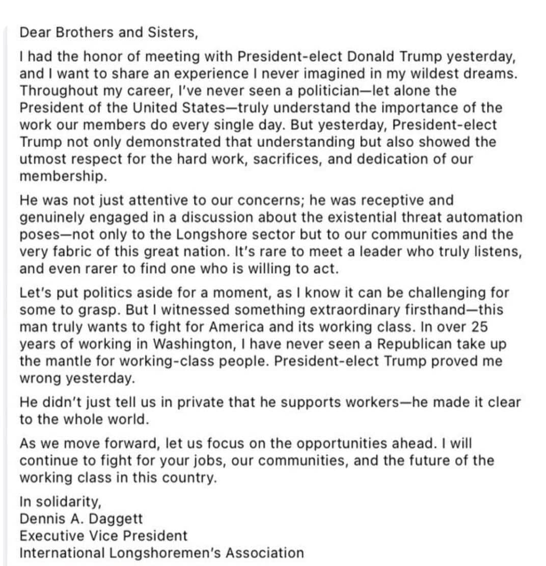 Đây là bức thư được gửi bởi Dennis A. Daggett, Phó chủ tịch điều hành của Hiệp hội công nhân bốc xếp quốc tế sau cuộc gặp với Tổng thống Trump vào tuần rồi. Mình tin ở bức thư với lời lẻ chân thật này