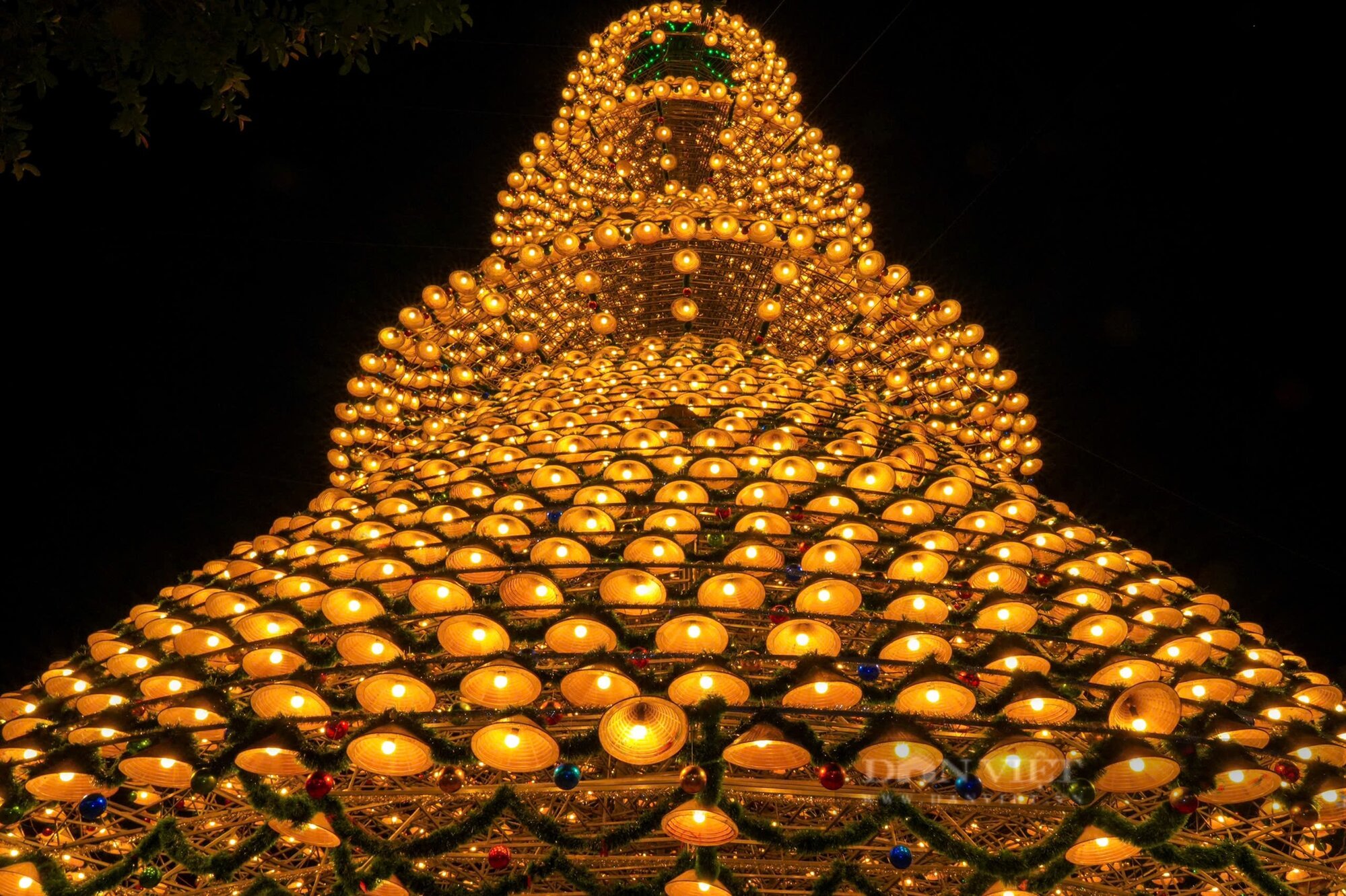 Những chiếc nón lá được xếp đặt khéo léo xung quanh bộ khung sắt nặng hàng tấn tạo thành hình cây thông Noel 4 tầng lung linh về đêm.