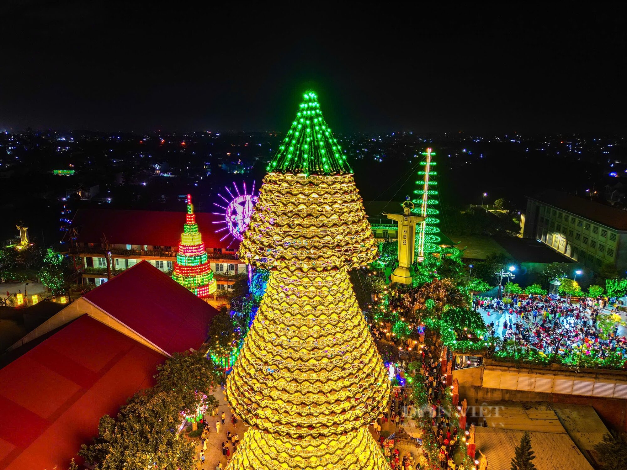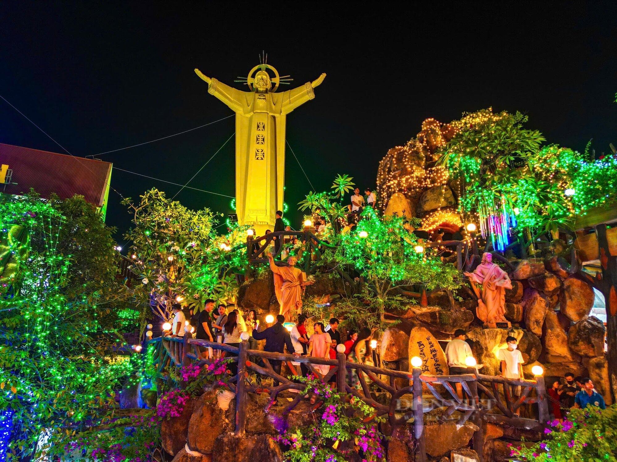 Bên cạnh cây thông, nhiều công trình khác như tượng Chúa, hang đá, tháp chuông... cũng được trang hoàng lộng lẫy.