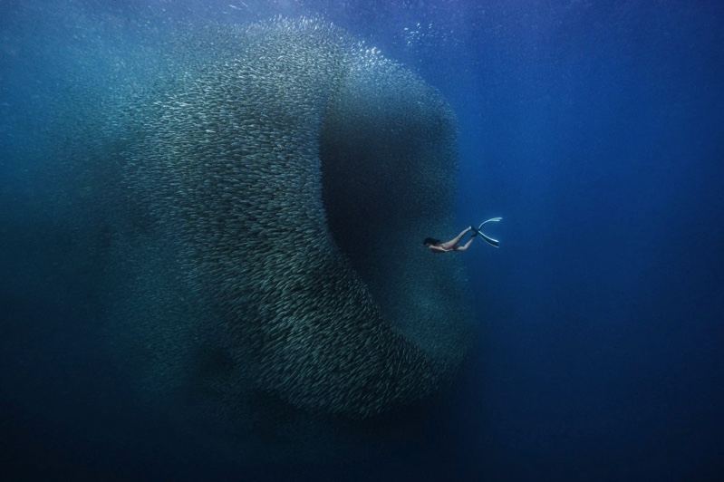 Đấy là một trong những bức ảnh đẹp nhất của năm 2024. Nhiếp ảnh gia người Chile Benjamin Yavar đã chụp được khoảnh khắc kì diệu này dưới đáy sâu Cebu, Philippines, khi một nữ thợ lặn đang bơi vào giữa một đàn cá hàng vạn con, mà sự di chuyển xoáy của chúng tạo thành một vòng tròn lớn. Một khoảnh khắc tuyệt đẹp không chỉ nhấn mạnh đến những chuyển động của người lặn và đàn cá, tạo nên sự cảm nhận về sức mạnh và năng lượng lớn lao dưới đáy đáy sâu mà còn nêu bật mối tương tác giữa con người và đại dương.