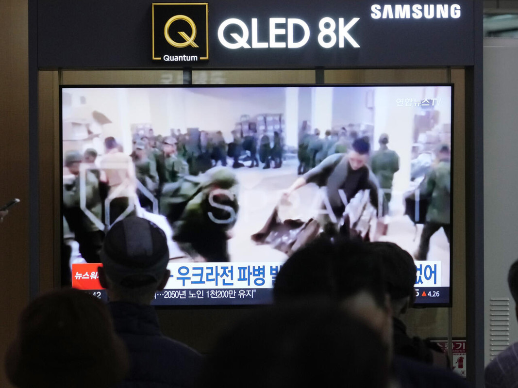 Một màn hình TV ở Seoul, Hàn Quốc, chiếu hình ảnh những người lính được cho là đến từ Bắc Triều Tiên xếp hàng để nhận tiếp tế từ Nga. Ảnh ngày 21/10/2024. AP - Ahn Young-joon