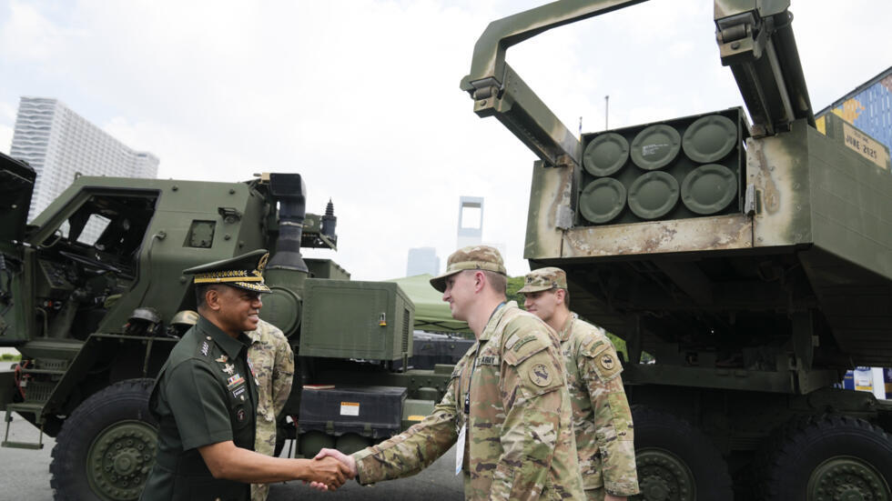 Tư lệnh quân đội Philippines, tướng Romeo Brawner Jr. chào đón binh sĩ Mỹ bên cạnh bệ phóng tên lửa HIMARS được trưng bày trong Triển lãm Quốc phòng và An ninh Châu Á, ngày 25/09/2024, tại Manila, Philippines. AP - Aaron Favila