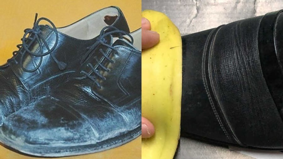 Nếu trong nhà có đồ da như giày da, túi da, áo da... thì hãy tận dụng vỏ chuối chín. Chúng hay bị vứt đi sau khi ăn chuối nhưng lại công dụng bất ngờ. Vỏ chuối chín có thể làm sạch và còn làm bóng đồ da. Bạn chỉ cần dùng mặt trong của vỏ chuối để chà xát lên bề mặt giày da. Vỏ chuối có dầu và tannin có tác dụng làm sạch và đánh bóng bề mặt giày da hiệu quả. Sau khi chà xát vỏ chuối lên mặt da thì dùng khăn mềm lau sạch là bề mặt sẽ bóng.