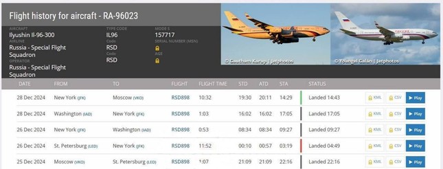 Theo trang web theo dõi chuyến bay Flightradar24, chiếc máy bay Il-96-300PU cất cánh từ Mátxcơva và hạ cánh tại sân bay quốc tế John F. Kennedy ở New York, sau đó bay đến Washington.