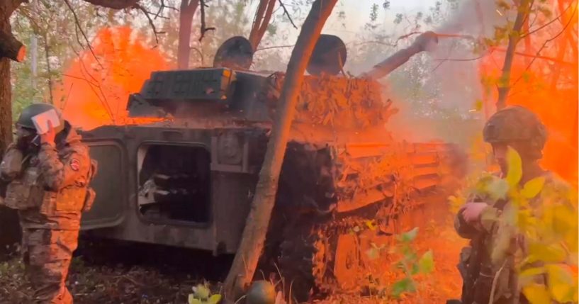 Một khẩu pháo Gvozdika 120mm của Nga đang bắn về phía các vị trí của Ukraine tại khu vực biên giới thuộc vùng Kursk của Nga trong một bức ảnh chụp vào tháng 10. (Dịch vụ báo chí Bộ Quốc phòng Nga / AP)