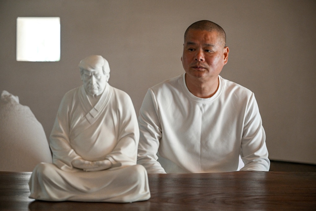 Nghệ nhân Hong Jinshi cạnh bức tượng ông Trump ngồi thiền tại thành phố Hạ Môn, tỉnh Phúc Kiến tháng 12/2024. Ảnh: AFP