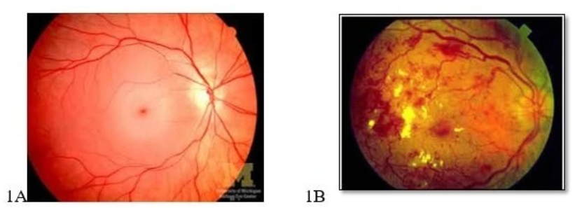 Hình ảnh đáy mắt (A. Bình thường; B. Bệnh võng mạc đái tháo đường). Ảnh: BVCC.