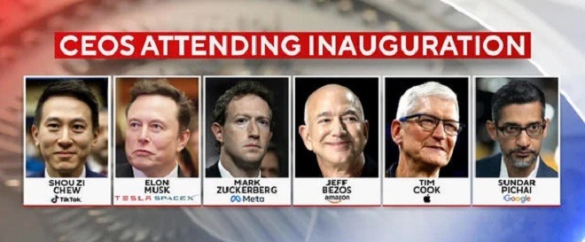 Một loạt CEO của các hãng công nghệ bao gồm Mark Zuckerberg của Meta, Jeff Bezos của Amazon, Elon Musk của Tesla, Tim Cook của Apple, Shou Chew của TikTok, và Sundar Pichai của Google cũng sẽ có mặt tại lễ nhậm chức của Tổng thống Mỹ đắc cử. Trong số các ông trùm công nghệ này, nhiều người đã trở nên thân thiết với ông Trump trong những tháng gần đây. Họ đã được sắp xếp ngồi trên bục nhậm chức cùng với những người được đề cử vào Nội các và các quan chức được bầu vào chính quyền mới của ông Trump.