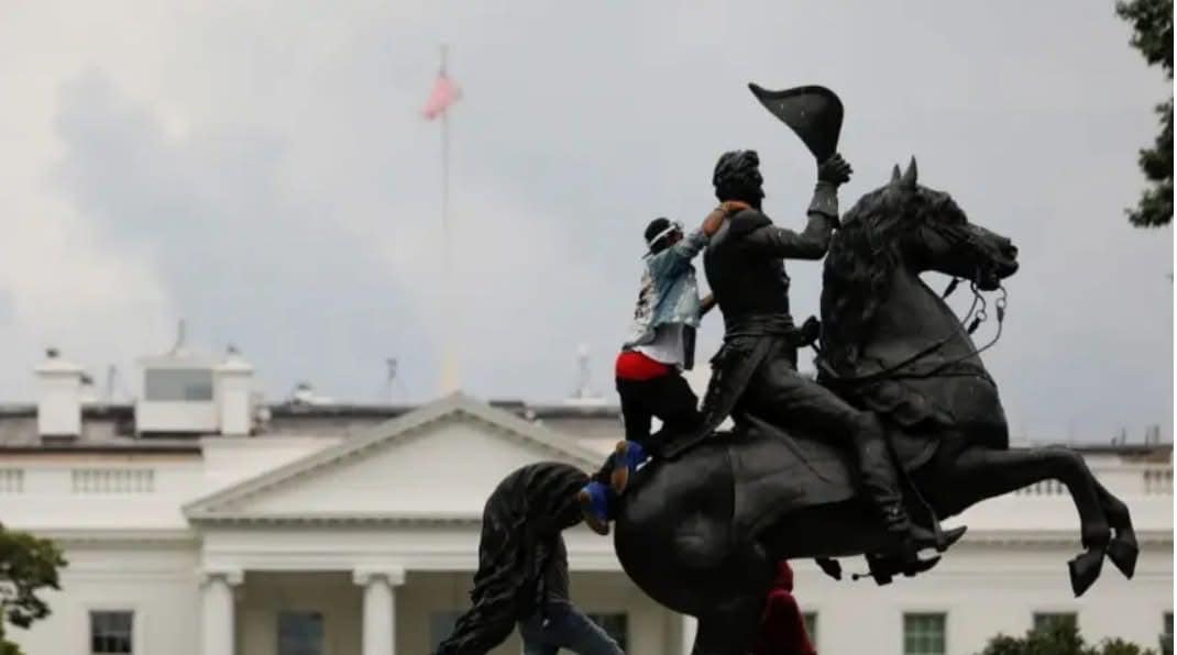 (cột phải, trên cùng): Hung hăng tìm cách phá tượng Tổng thống Andrew Jackson, xóa bỏ ký ức lịch sử định cõi lập quốc.