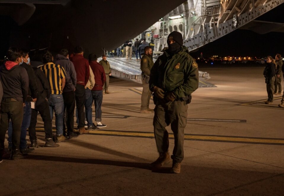 Hướng dẫn người nhập cư không có giấy tờ lên máy bay C-17 Globemaster III tại sân bay quốc tế Tucson, bang Arizona, ngày 23/1 (Ảnh: AP)
