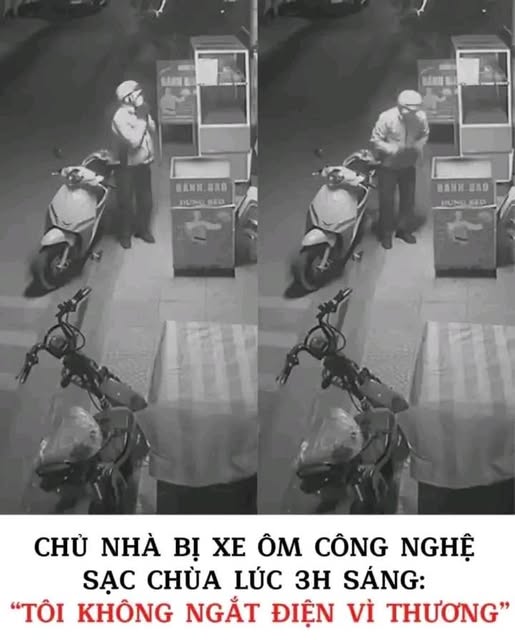 Hà Nội lúc 3h13 sáng, một tài xế xe ôm công nghệ tranh thủ sạc nhờ xe điện trước hiên nhà. Sạc xong, anh còn đứng vái lạy để cảm ơn chủ nhà.