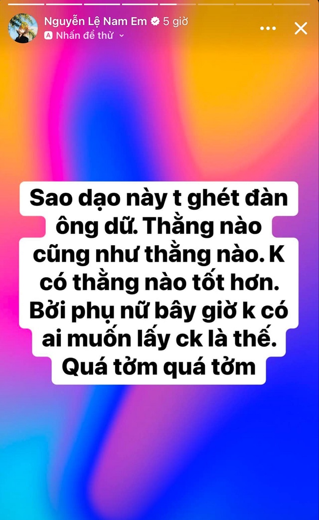 “Sao dạo này tao ghét đàn ông dữ. Thằng nào cũng như thằng nào. Không có thằng nào tốt hơn. Bởi phụ nữ bây giờ không có ai muốn lấy chồng là thế. Quá tởm quá tởm”,Nam Em cho hay.