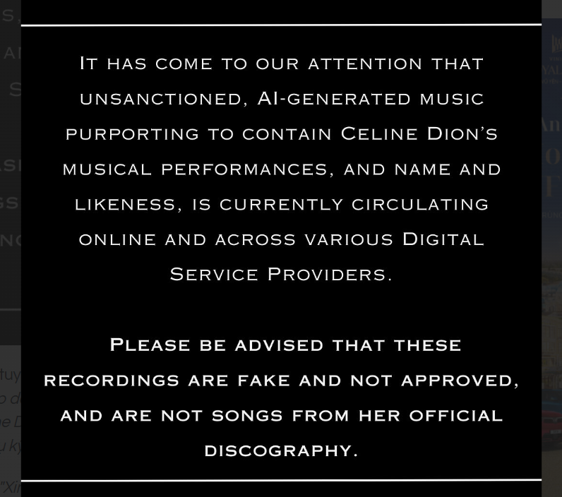Bài đăng mở đầu với tuyên bố: "Chúng tôi nhận thấy rằng một số bản nhạc không được cấp phép do AI tạo ra, bao gồm các buổi biểu diễn âm nhạc, tên và hình ảnh của Celine Dion, hiện đang được lưu hành trên mạng và trên nhiều Nhà cung cấp dịch vụ kỹ thuật số".