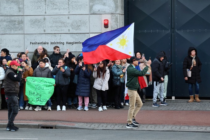 Chiếc xe được cho là chở cựu tổng thống Philippines Rodrigo Duterte hôm 12/3 đi vào nhà tù Scheveningen của Tòa Hình sự Quốc tế (ICC) ở The Hague, Hà Lan, sau khi chuyến bay chở ông hạ cánh ở Rotterdam. Khi xe đi qua, hàng chục người ủng hộ ông đứng vẫy cờ Philippines, một số người hét lên: "Đưa ông ấy trở về nước".