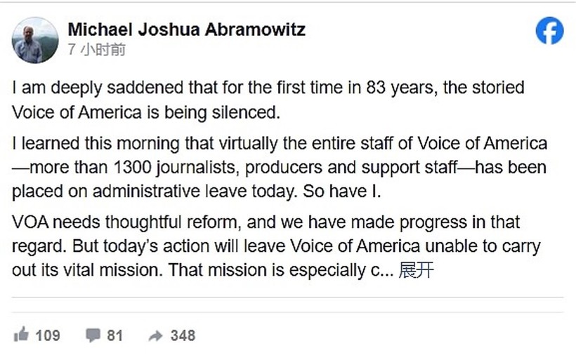 Ông viết, "Đây là lần đầu tiên trong 83 năm, Đài VOA bị bịt miệng", nhấn mạnh rằng “sứ mệnh của VOA là thúc đẩy tự do và dân chủ trên toàn thế giới bằng cách đưa tin về nước Mỹ và cung cấp tin tức, thông tin khách quan và cân bằng”.
