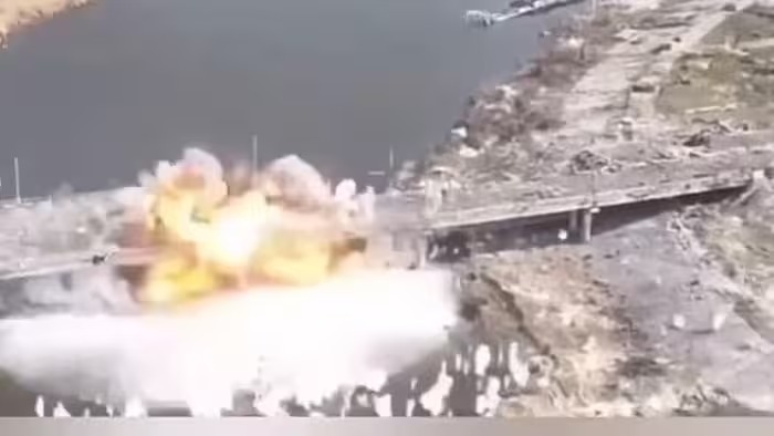 Trong đoạn video, hai nhịp cầu bị cho nổ tung, rơi xuống sông, tạo ra một đám khói dày khổng lồ.