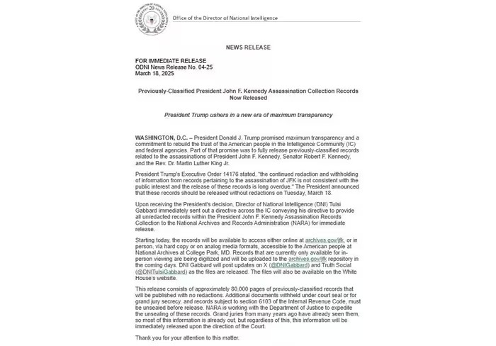 Bản thông báo giải mật Hồ sơ ám sát JFK mới cho biết sẽ không có bất kỳ biên tập nào. Ảnh: Nhà Trắng