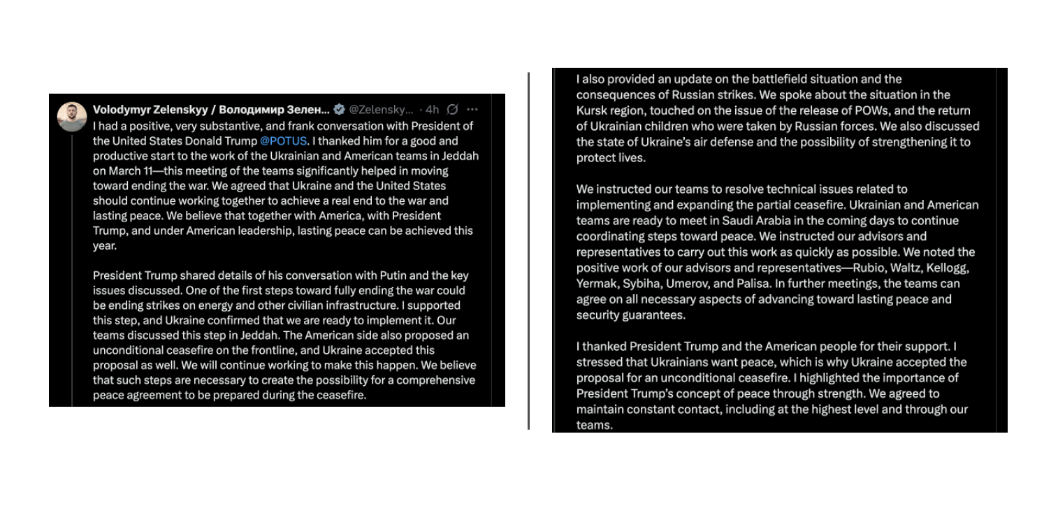 Thông báo của Tổng thống Ukraine Volodymyr Zelensky về cuộc điện đàm với Tổng thống Mỹ Donald Trump. Ảnh chụp màn hình tài khoản mạng xã hội X của Tổng thống Ukraine Volodymyr Zelensky