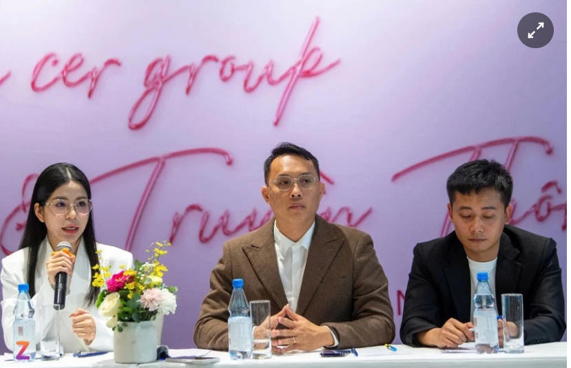Quang Linh Vlogs, Hằng Du Mục và ông Lê Tuấn Linh - Tổng Giám đốc công ty CER tại buổi họp báo chiều 14/3. Ảnh: Việt Linh.