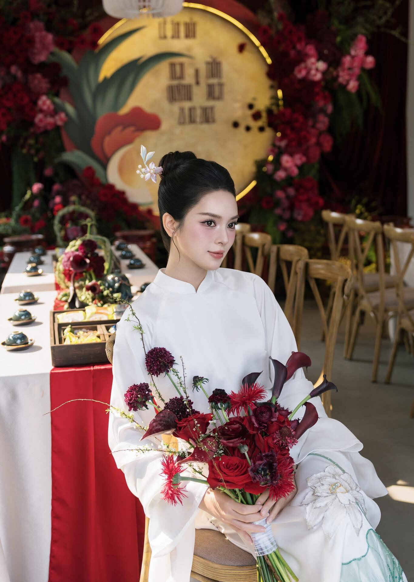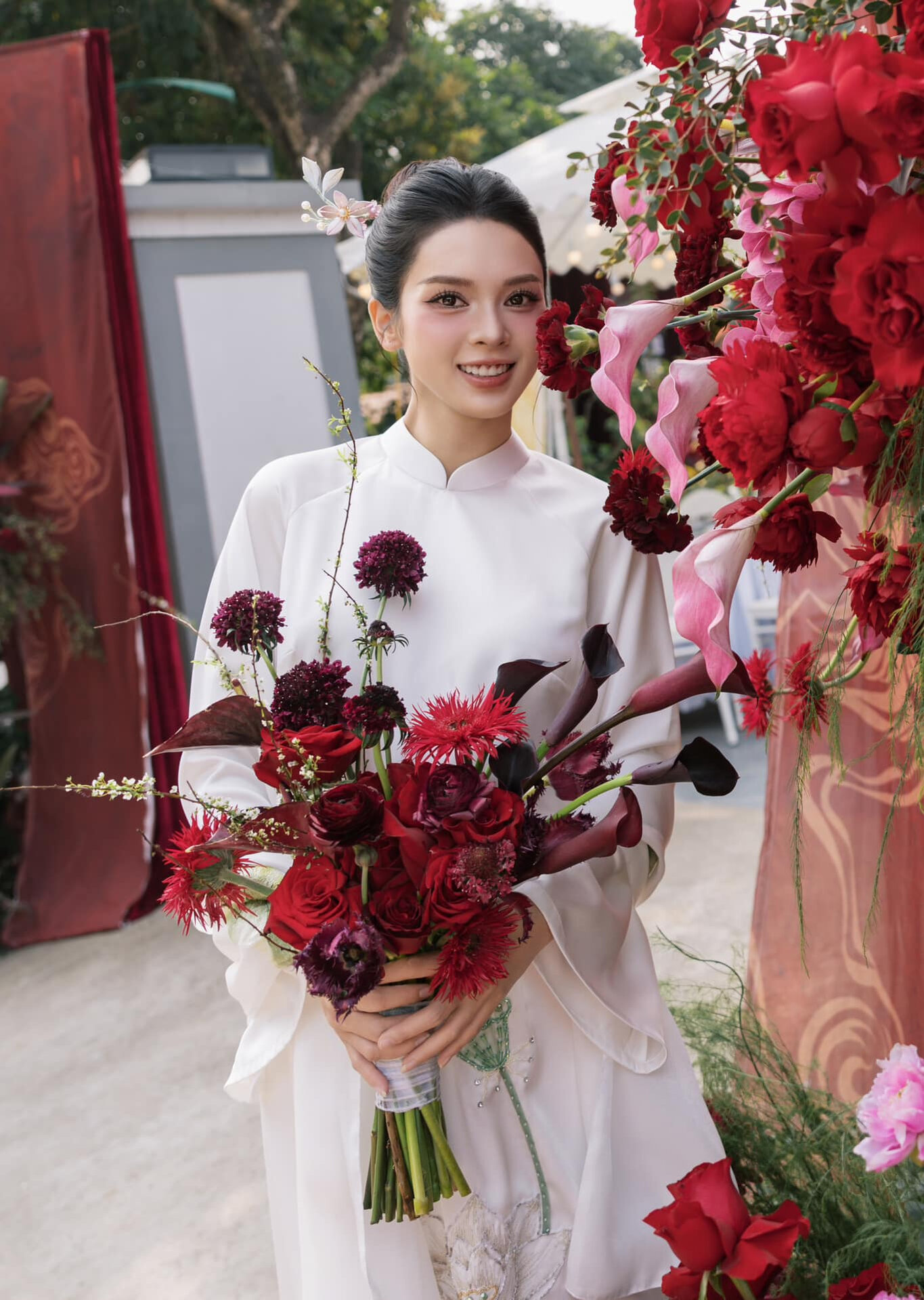 Trong ngày lễ Vu quy, Quỳnh Lương diện áo dài trắng dáng suông che bụng bầu. Cô trang điểm tự nhiên, búi tóc cao. Tông trang điểm hồng đào giúp gương mặt Quỳnh Lương trông rạng rỡ, trong trẻo, mặn mà nhưng không kém phần đài các.