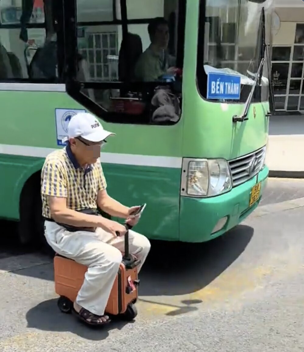 Cảnh người đàn ông lớn tuổi "cưỡi" vali như một phương tiện giao thông di chuyển trên đường phố. Ảnh: Cắt từ clip
